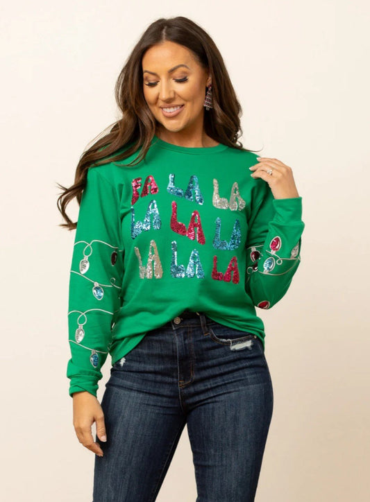 FA LA LA SEQUINS ON GREEN SWEATSHIRT