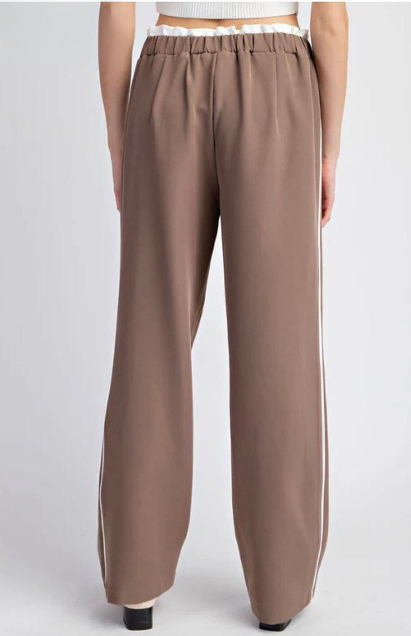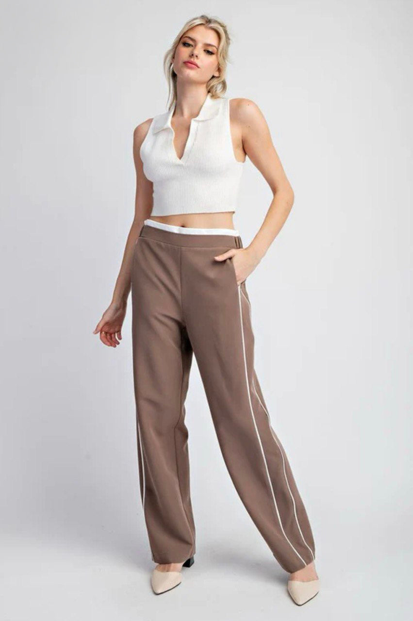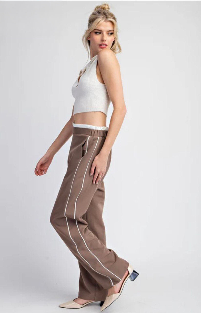 2 Solid straight leg pants with striped side detailing, two side hip pockets, added elastic in the back for comfort, a double layered hem and is a comfy pair of pants that you can style to dress up!
